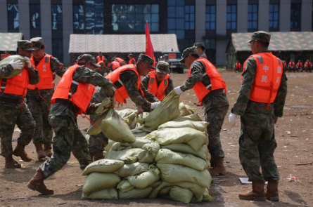 江汉风报道:6月25日,荆州军分区2024年抗洪抢险群众性练兵比武在纪南文旅区长湖之畔举行。