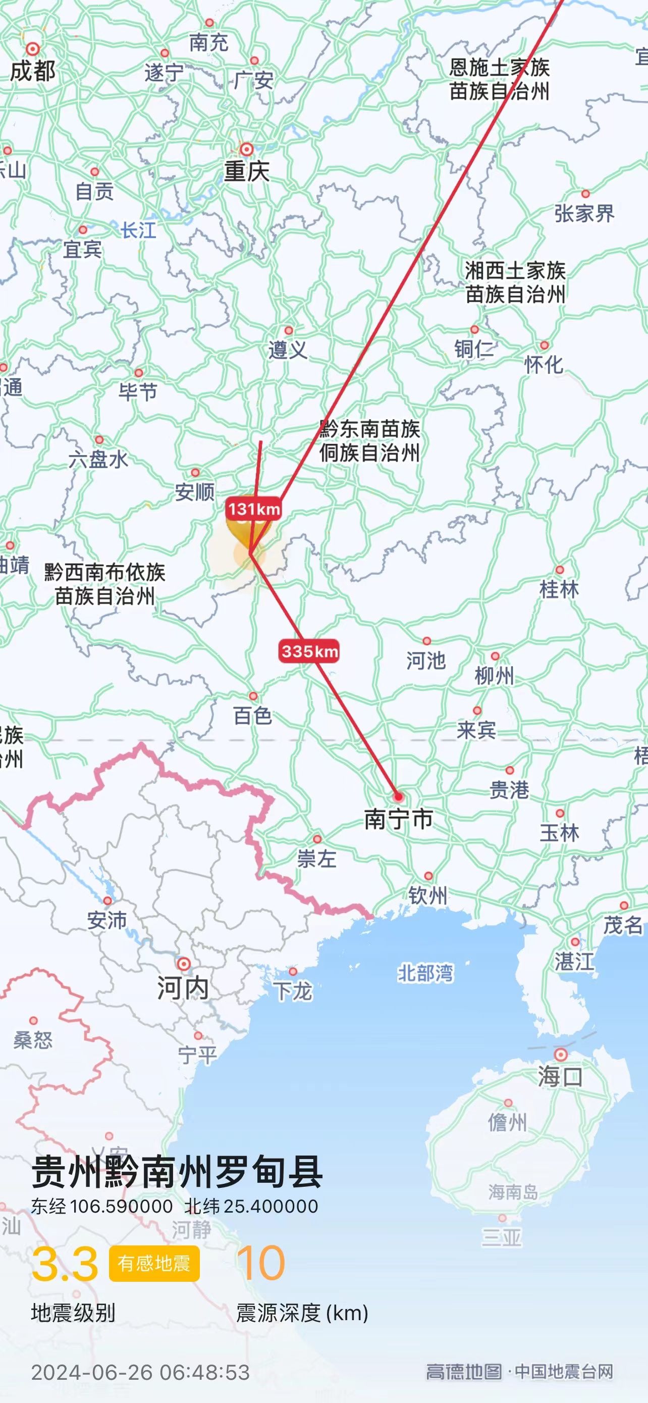 中国地震台网正式测定:06月26日06时48分在贵州黔南州罗甸县(北纬25.40度,东经106.59度)发生3.3级地震,震源深度10千米。