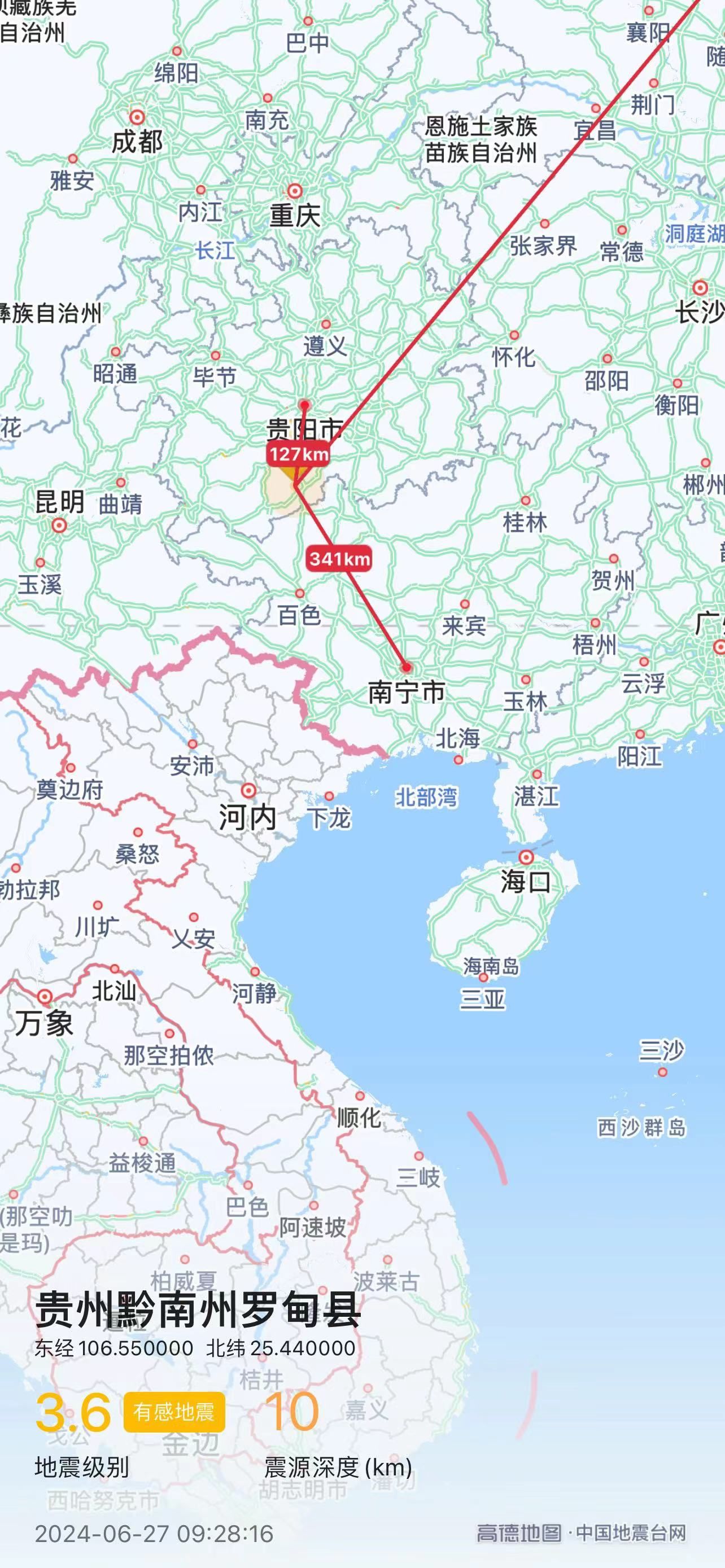 中国地震台网正式测定:06月27日09时28分在贵州黔南州罗甸县(北纬25.44度,东经106.55度)发生3.6级地震,震源深度10千米。