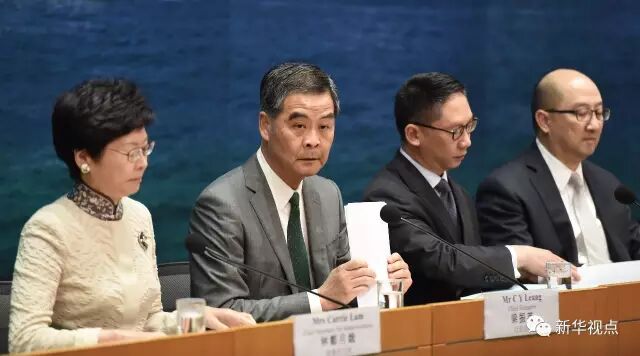11月7日,香港特区行政长官梁振英表示,行政长官和特区政府支持全国人大常委会11月7日通过的关于香港基本法第一百零四条的解释,行政长官和特区政府将全面切实执行。图为香港特区行政长官梁振英(左二)在记者会上讲话。新华社记者吕小炜摄