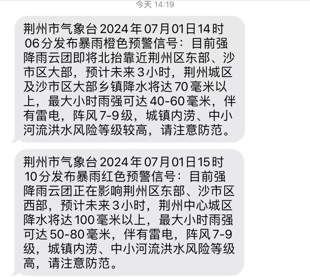 荆州市气象台2024年07月01日15时10分发布暴雨红色预警信号:目前强降雨云团正在影响荆州区东部、沙市区西部,预计未来3小时,荆州中心城区降水将达100毫米以上,最大小时雨强可达50-80毫米,伴有雷电,阵风7-9级,城镇内涝、中小河流洪水风险等级高,请注意防范。