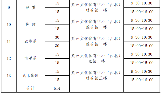 在荆州市体育运动学在14个项目处(篮球、羽毛球、乒乓球、网球、体操、田径、游泳、摔跤、柔道、跆拳道、举重、武术套路、空手道、科学选材),免费使用现场设施、观摩专业训练,到14个打卡点集齐14个印章后,方可在综合馆抽奖处抽取幸运(运动)大礼包!