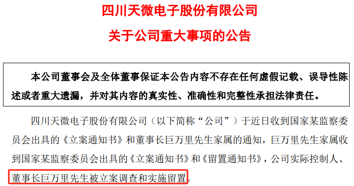 6月30日下午,天微电子突然公告,公司实际控制人、董事长巨万里被立案调查和实施留置。