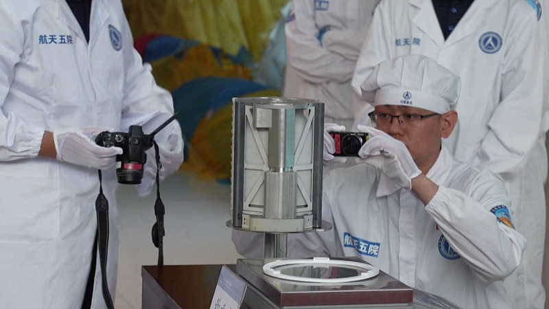 6月26日,北京,嫦娥六号返回器开舱活动在中国航天科技集团五院举行。科研人员拍摄月球土壤样本。图源:视觉中国