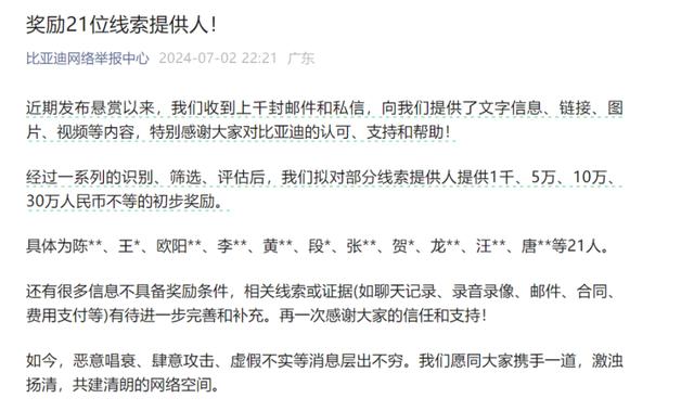 比亚迪表示,还有很多信息不具备奖励条件,相关线索或证据(如聊天记录、录音录像、邮件、合同、费用支付等)有待进一步完善和补充。再一次感谢大家的信任和支持!