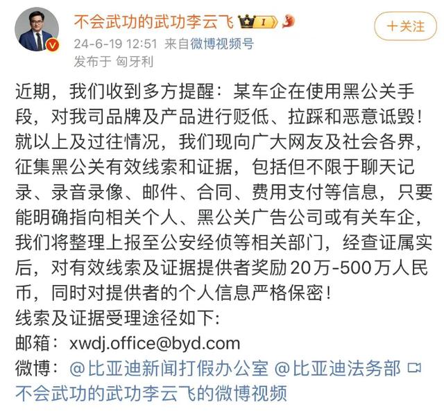 据此前报道,6月19日比亚迪品牌及公关处总经理李云飞发文称,某车企在使用黑公关手段,对该公司品牌及产品进行贬低、拉踩和恶意诋毁。现向广大网友及社会各界,征集黑公关有效线索和证据,对有效线索及证据提供者奖励 20 万-500 万人民币。