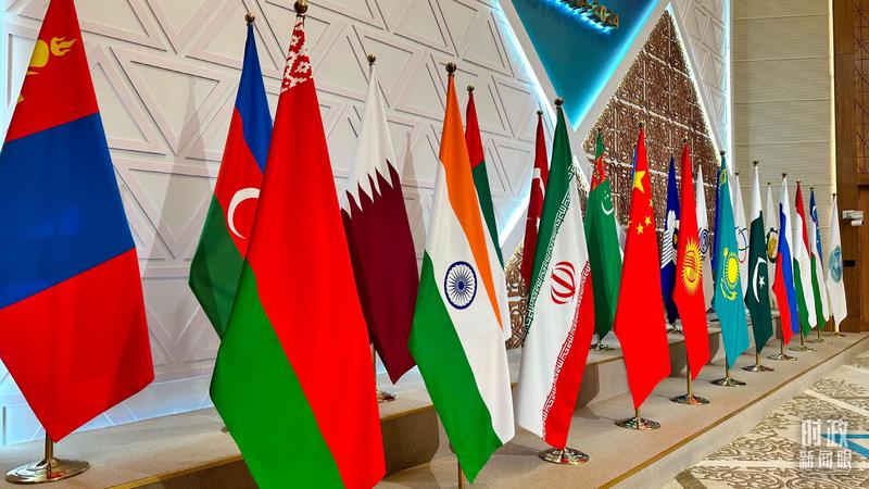 △阿斯塔纳峰会现场摆放的旗帜。(总台央视记者关舟拍摄)