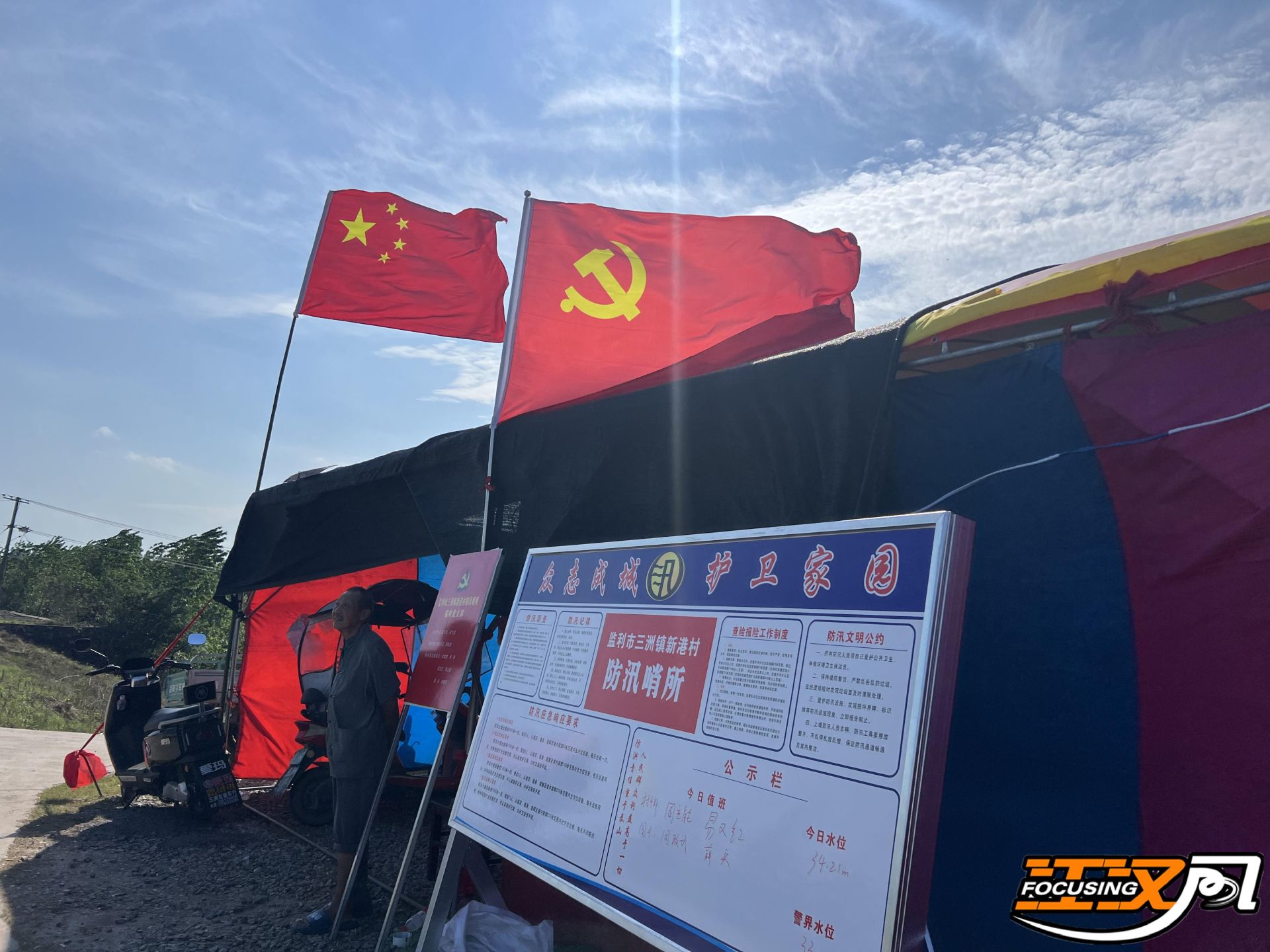 6月30日,三洲联垸进入警戒水位后,地处三洲北大门的新港村率先在围堤上成立临时党支部,由村两委带头搭建防汛哨所,党旗高高飘扬、党员冲锋在前、村民自发参与,47.8公里的三洲围堤上有了第一个“红色哨棚”。哨所纪律严明,按照当前防汛应急响应要求,每个哨所配备一名村干部加六个哨兵,与自发前来的村民一道查险、报险、抢险。