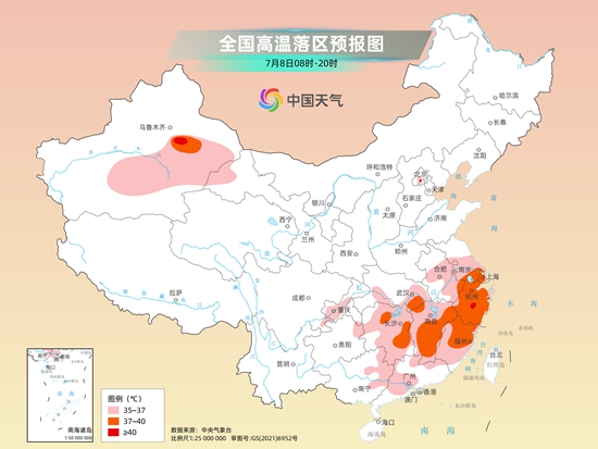 未来一周,江南、华南大部、江淮等地将出现持续性高温天气,今明天为此轮高温天气最强时段,为此今晨中央气象台继续发布高温黄色预警。预计,今天白天,新疆南疆盆地和吐鲁番盆地、苏皖中南部、上海、湖北南部、湖南大部、江西、浙江、福建、广西东部、广东中西部和北部等地有35℃至36℃高温天气,其中,新疆吐鲁番盆地、江苏南部、上海大部、湖北东南部、湖南北部和东部、江西中南部、浙江大部、福建中北部等地部分地区最高气温37℃至39℃,新疆吐鲁番盆地、浙江中部局地可达40℃以上。