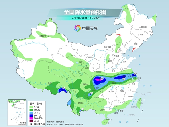 明天开始,雨带将随着副热带高压南北摆动。预计明天至13日,雨带西段维持在四川盆地、西北地区东南部,雨带东段南压至江淮一带。