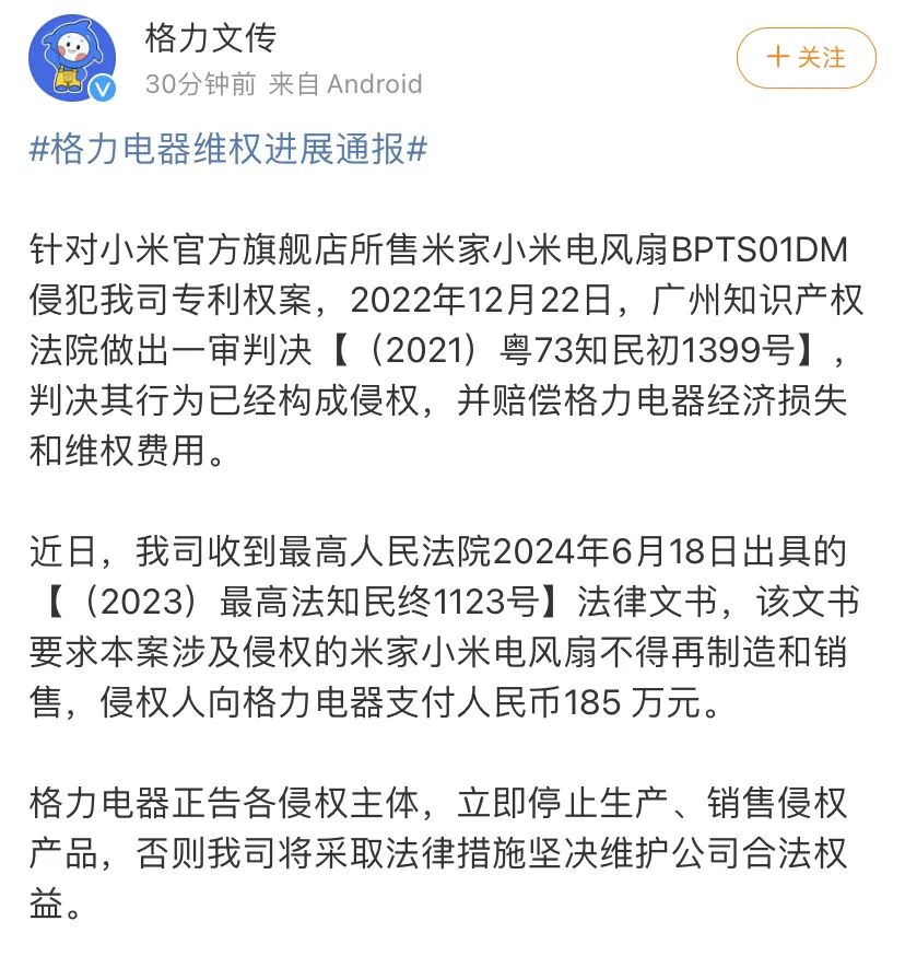 7月9日晚间,据“格力文传”官微消息,近日,格力电器收到最高人民法院2024年6月18日出具的【(2023)最高法知民终1123号】法律文书,该文书要求本案涉及侵权的米家小米电风扇不得再制造和销售,侵权人向格力电器支付人民币185万元。