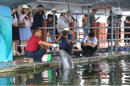 微风吹拂,碧波荡漾。江豚繁育区内,江豚“天天”“萌萌“方方”在网箱里自在游曳。随着工作人员的投食,不时跃出水面。优雅的身姿引得观赏者们惊叫连连。