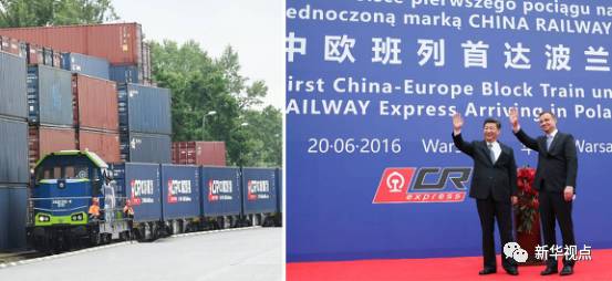 2016年6月20日,国家主席习近平同波兰总统杜达在华沙共同出席统一品牌中欧班列首达欧洲(波兰)仪式。左图为带有统一标识的中欧班列鸣笛缓缓驶入站台;右图为两国元首向班列挥手致意。新华社记者谢环驰、兰红光摄