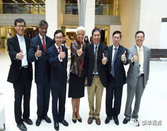 2016年9月30日,在位于美国华盛顿的国际货币基金组织(IMF)总部,IMF总裁拉加德(中)、IMF副总裁张涛(左三)、中国驻国际货币基金组织执董金中夏(右三)、IMF秘书长林建海(右二)等合影。 新华社记者殷博古摄