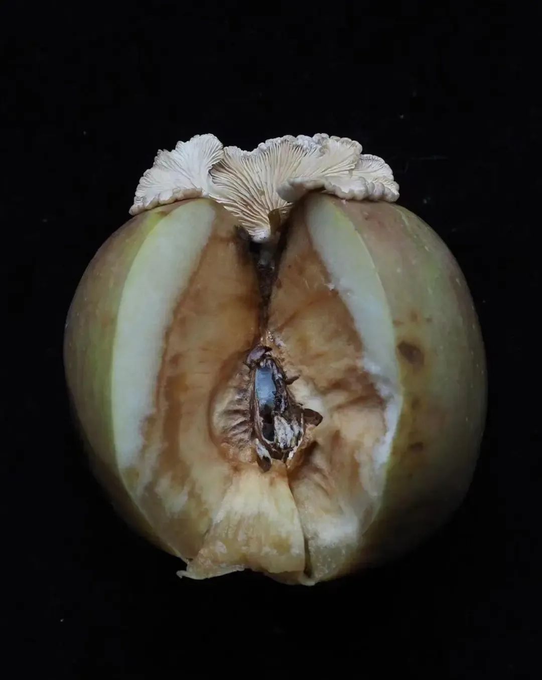 图片显示,一株白色、带有褶皱的蘑菇从果柄处长出,从顶部看苹果表面完好无损,底部却已腐烂变质。
