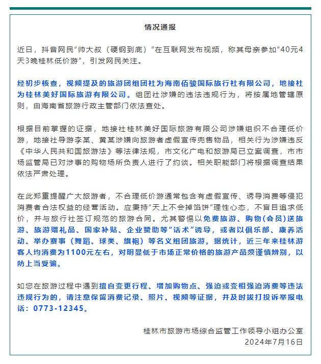 近日,抖音网民“帅大叔(硬钢到底)”在互联网发布视频,称其母亲参加“40元4天3晚桂林低价游”,引发网民关注。