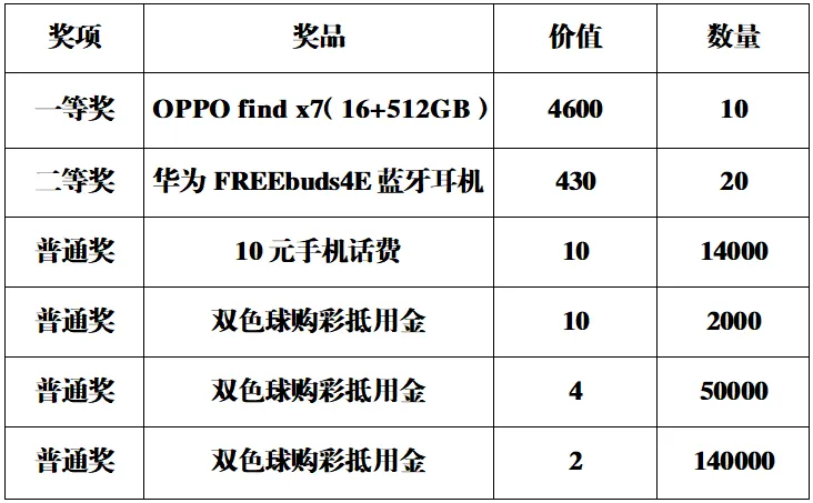 “双色球3种复式玩法中奖就免单!单票满20元不中奖还能抽70万好礼!”双色球游戏第2024079期起(7月11日开奖),湖北福彩双重活动重磅开启,10+1、11+1、12+1三种复式中奖就免单,单票满20元的双色球彩票开奖后如没中奖,还有抽取OPPO find x7(16+512GB)、华为FREEbuds4E蓝牙耳机、手机话费、购彩抵用金等总价值70万礼品机会!让您体会双色球独特的游戏魅力!