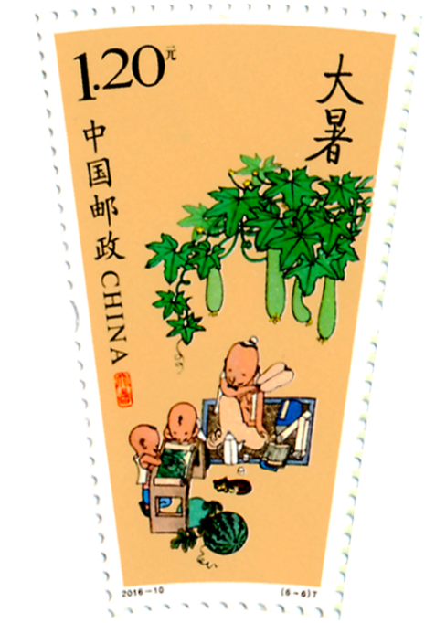 著名中国画家吴冠英在邮票里充分展示了大暑的特征。邮票的主人翁在果实壮硕的藤架下,坐在凉席上休憇,用扇子降温和驱赶蚊虫,阅读线装古籍书。喝着防暑茶饮料。孩子们在矮几上贪婪地认真观看画卷,从中学习汲取知识,连身边的西瓜也顾不上吃。小猫热得懒得动弹在睡觉。整个画面一幅温馨和睦的家庭样子。