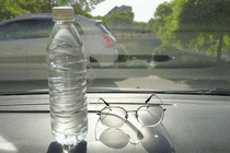 在阳光的猛烈照射下,矿泉水瓶和眼镜会像放大镜一样聚集光线,阳光汇于一点,点燃中控台,导致车内物体燃烧,引起车辆自燃。