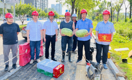 工作人员将西瓜、饮料等消暑降温用品送到一线员工手中,询问大家的身体状况和工作情况,并叮嘱大家在高温天气要注意防暑、劳逸结合,调整好工作与休息的时间。