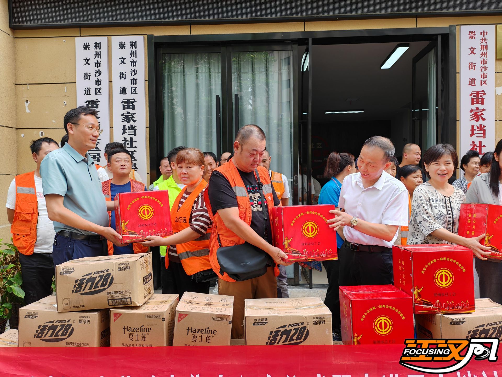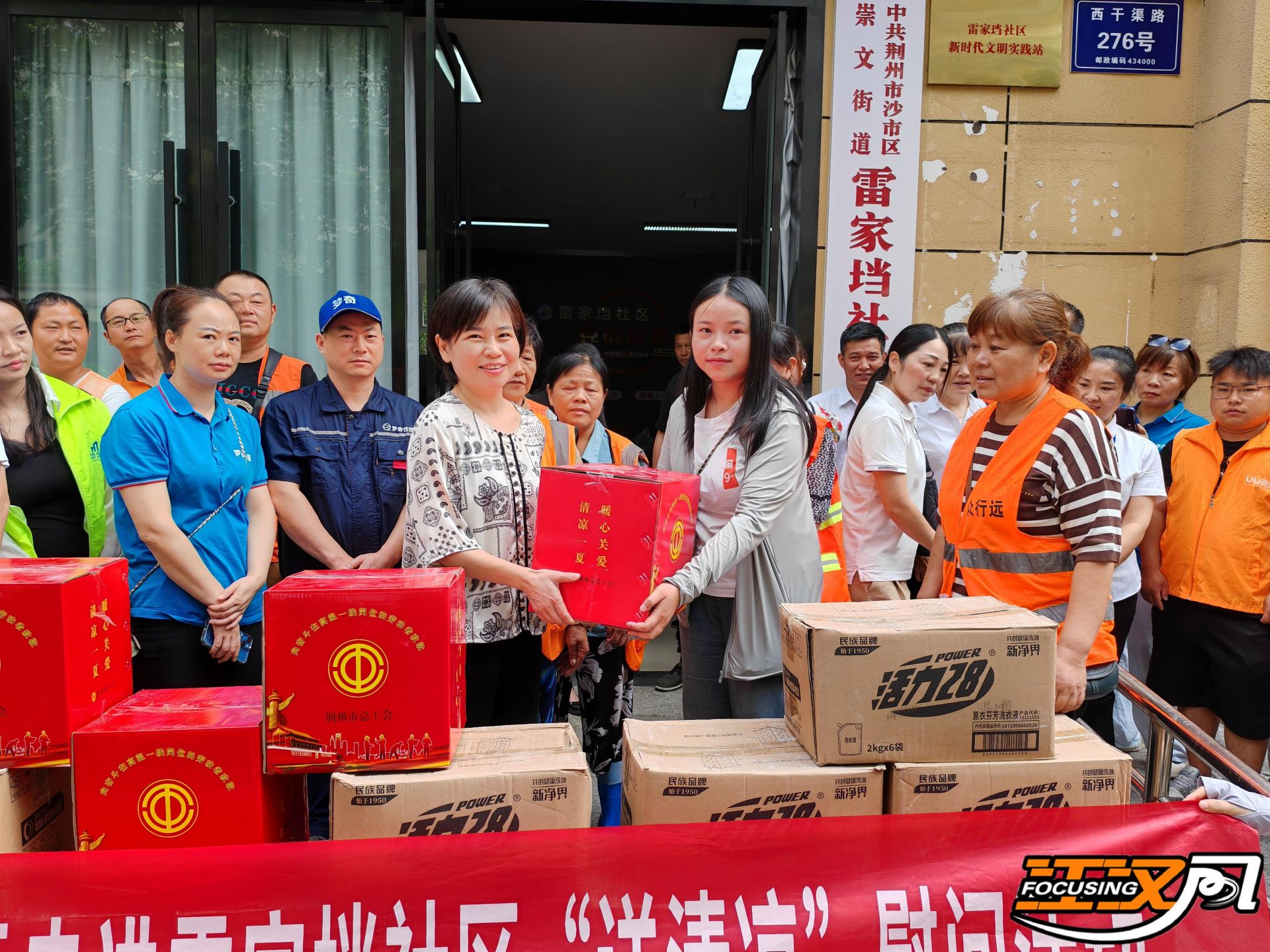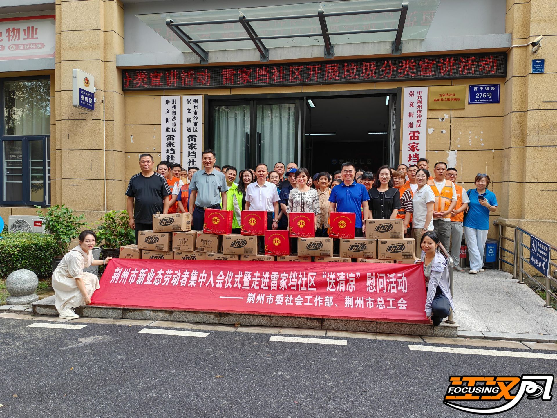 仪式结束后,荆州市总工会工作人员为大家发放清凉饮品、防暑药品等物资,向在酷暑中坚守岗位的新业态工作者们表达敬意和关怀,细心叮嘱他们在高温下作业要注意防护和防暑降温,合理安排作息时间,确保自身安全。
