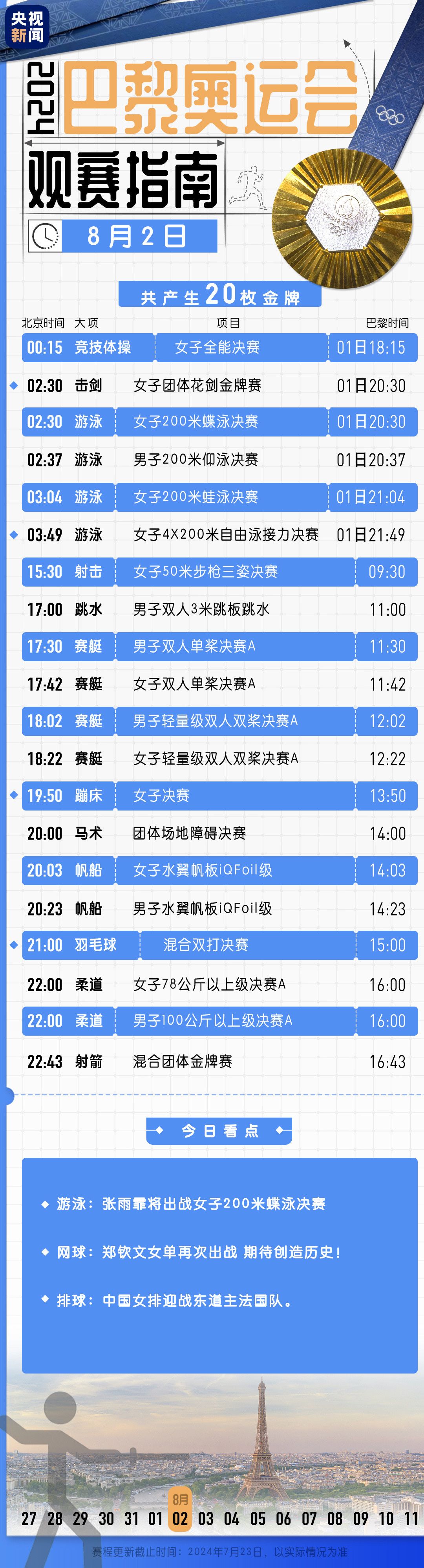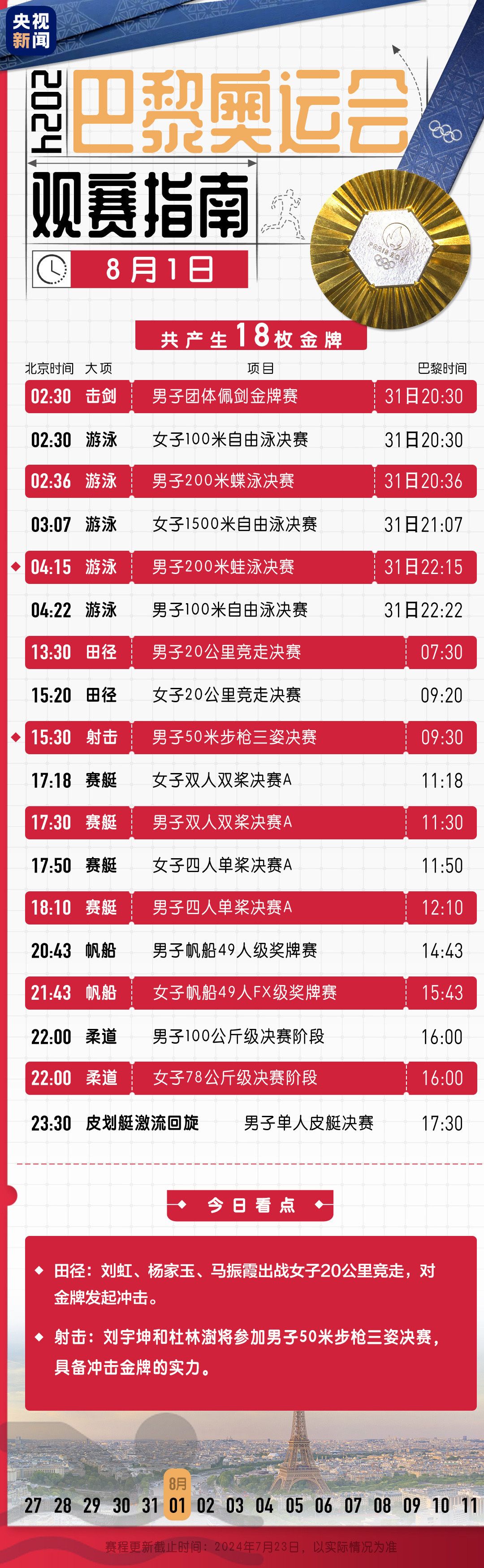 巴黎奥运会第六个比赛日将产生18枚金牌。中国体育代表团将在网球、游泳、田径、赛艇等项目上冲击奖牌甚至金牌。