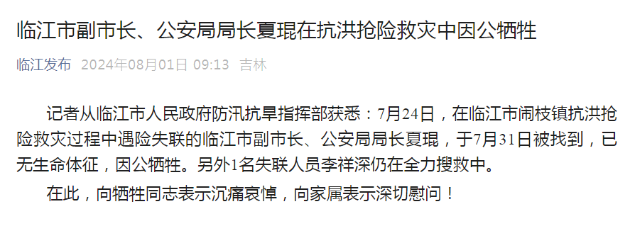 据吉林“临江发布”8月1日消息,记者从临江市人民政府防汛抗旱指挥部获悉:7月24日,在临江市闹枝镇抗洪抢险救灾过程中遇险失联的临江市副市长、公安局局长夏琨,于7月31日被找到,已无生命体征,因公牺牲。另外1名失联人员李祥深仍在全力搜救中。