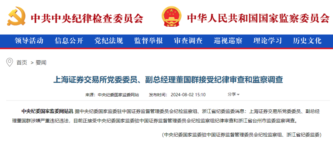 中央纪委国家监委网站8月2日通报,据中央纪委国家监委驻中国证券监督管理委员会纪检监察组、浙江省纪委监委消息:上海证券交易所党委委员、副总经理董国群涉嫌严重违纪违法,目前正接受中央纪委国家监委驻中国证券监督管理委员会纪检监察组纪律审查和浙江省台州市监委监察调查。