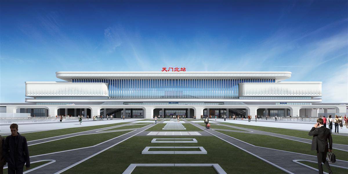 天门北站位于天门市杨林街道,站房建筑面积约2万平方米,站场规模为3台7线。车站设计从“楚风汉韵毓俊才,茶圣故里羡中外”的文化意境出发,营造庄重典雅、简洁大气的站房形象。建筑立面开窗通过流线形体勾勒出天门山的绵延起伏形态,同时为室内带来丰富的光影效果。