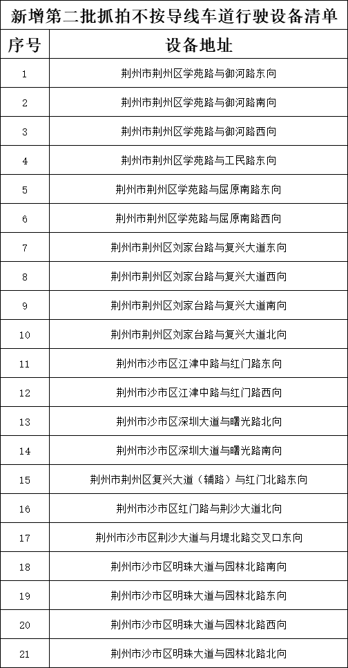 为了进一步规范交通秩序,提高道路通行效率,荆州交警将逐步开启不按导向车道行驶违法行为电子警察抓拍。近期荆州交警对荆州市中心城区21处点位的交通标志、标线及信号灯进行了排查梳理,配时方案进行了优化,车道进行调整,已确认规范一致。在2024年8月15日前,针对新增21处点位抓拍不按导向车道行驶的违法行为,将发送短信提醒、警告,在2024年8月15日后,将依法进行处罚。