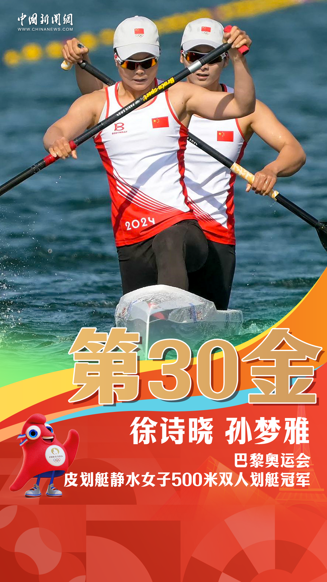 第30金!徐诗晓、孙梦雅成功卫冕 2024-08-09 18:59 中国新闻网 8 北京时间8月9日,在巴黎奥运会皮划艇静水女子500米双人划艇决赛中,东京奥运会该项目金牌得主徐诗晓/孙梦雅卫冕成功。 这是中国体育代表团在巴黎奥运会获得的第30金,也是皮划艇静水项目中中国队获得的第2金。 恭喜!