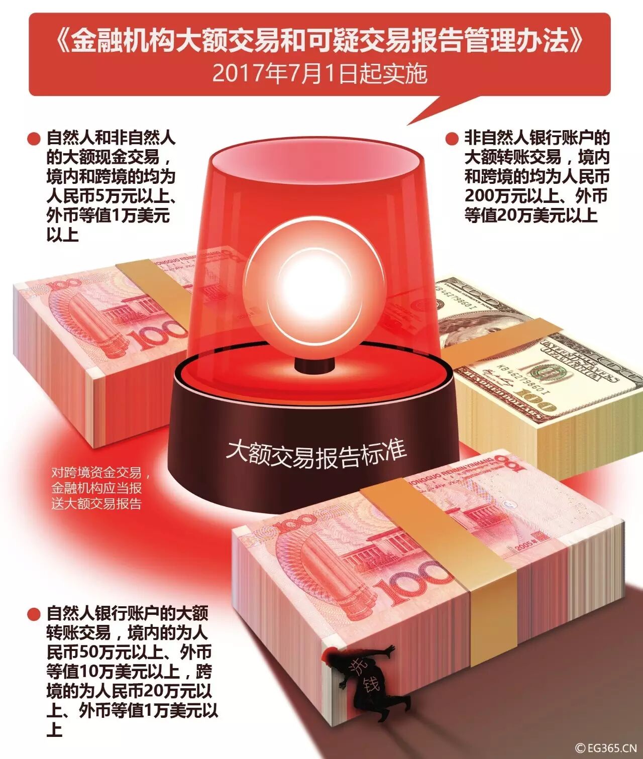 近日,中国人民银行发布了《金融机构大额交易和可疑交易报告管理办法》,自2017年7月1日起实施。该办法将大额现金交易的人民币报告标准由“20万元”调整为“5万元”,并规定自然人以人民币计价的大额跨境交易报告标准为“人民币20万元”。