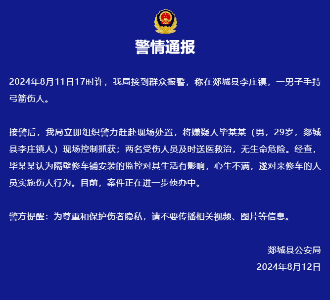 8月12日,山东郯城县公安局发布警情通报,内容如下:
