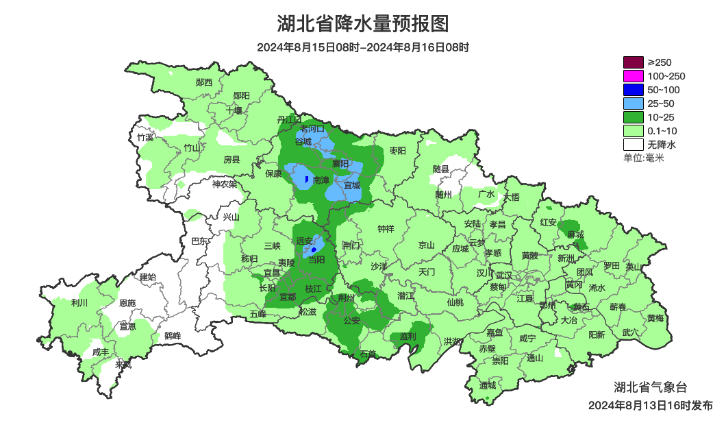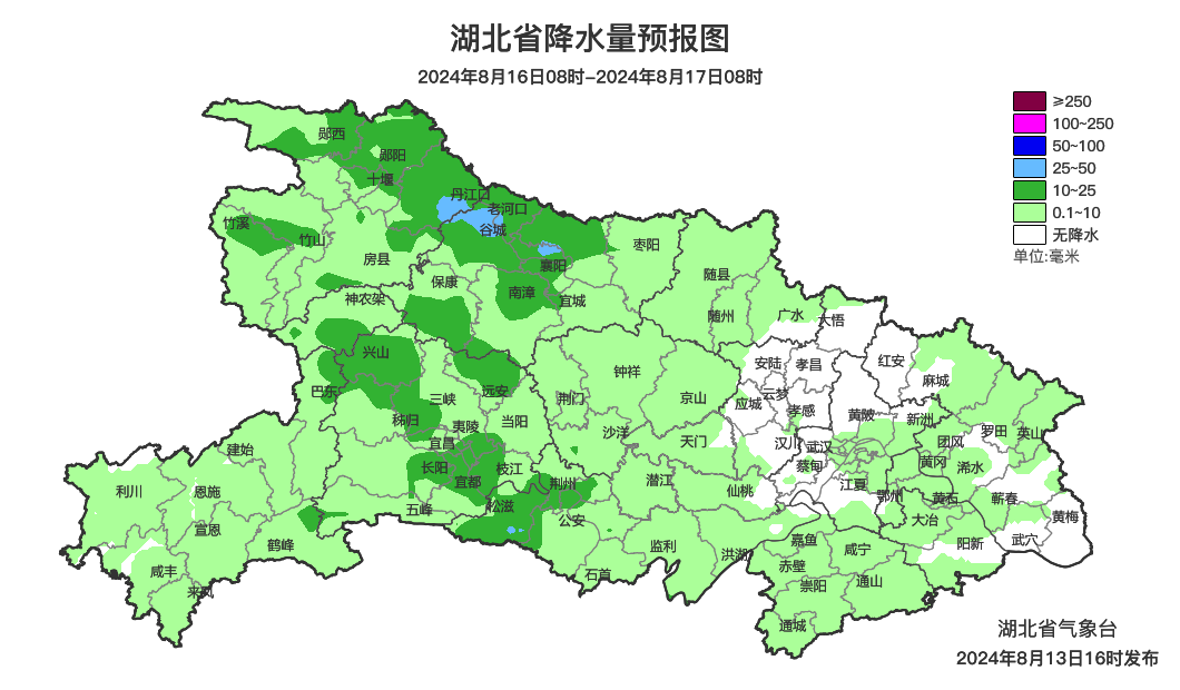 昨天(13日)湖北省晴天到多云为主,恩施南部和鄂东东部出现雷阵雨,13个县市区25个乡镇暴雨,最大为阳新县半壁山农场97.1毫米、该站最大小时雨强为79.9毫米(13时45分);武汉、黄冈等地10个乡镇出现8到10级雷暴大风。最高气温1126个乡镇超过35℃,其中634个乡镇超过37℃,最高为宜昌大礼站点42.4℃。