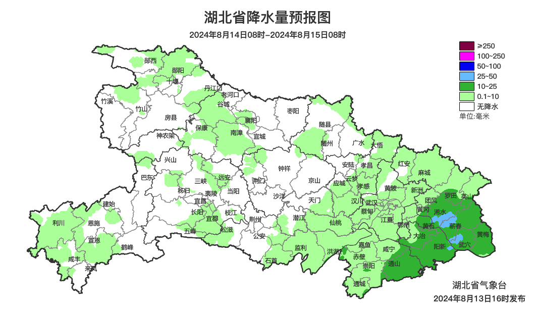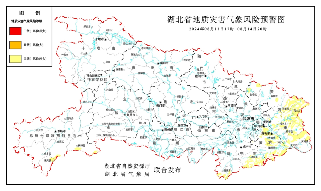 2024 年 8 月 13 日 17 时—8 月 14 日 20 时,预计黄石地区,恩施(来凤东北部、宣恩南部、鹤峰南部和东部)、鄂州(鄂城区)、咸宁(通城、通山)、黄冈(黄州区东北部、红安中西部和东北部、麻城中东部、团风南部、罗田、英山、浠水、蕲春、武穴、黄梅)以及其他强降水区域发生崩塌、滑坡、泥石流的风险较大。