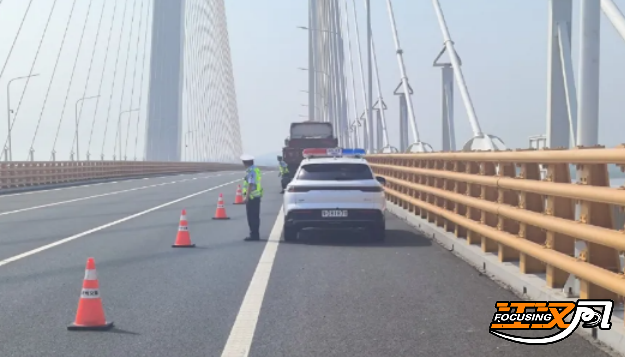 8月11日上午9时35分,荆州高警监利大队民警巡逻至赤壁长江大桥K33+150m处,发现一辆货车打着双闪停在应急车道。民警立即停车打开警报器,安排人员在车辆后方150米摆放反光锥桶做好警戒,提醒后方车辆减速慢行。