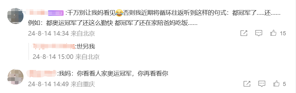 看到这一幕的网友们,一方面给盛李豪点赞:射击场上一举夺魁风光无限,回到家里低调孝顺做得好饭。另一方面,很多网友都表示:“千万别让我妈看见,不然她会说,你看看人家奥运冠军,你再看看你!”