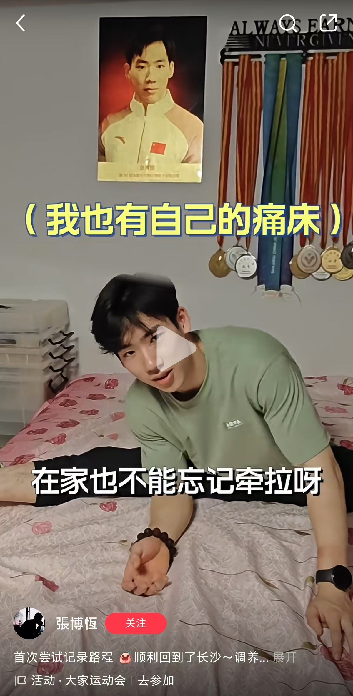 他还在床上一边牵拉,一边“不经意”露出了身后一面挂满奖牌的墙,他说:“我也有自己的痛床。”(痛床:用喜爱的动漫周边来做装饰的床)