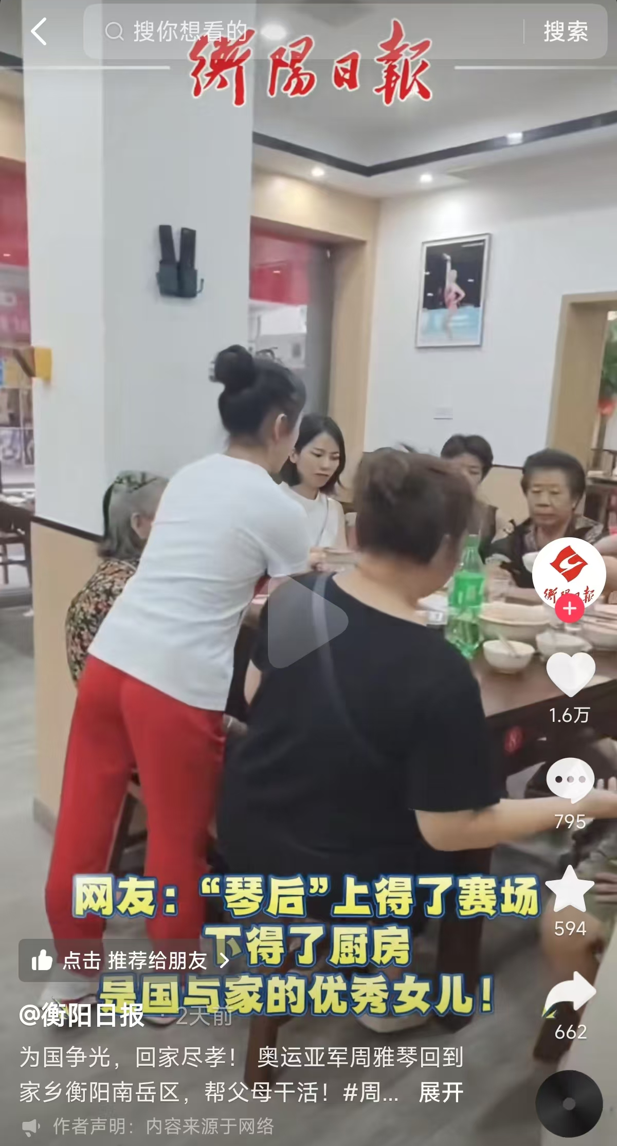 还穿着体操队训练服的周雅琴,回到家里的土菜馆马上“无缝切换”身份,化身土菜馆小服务员:传菜、切水果、打扫卫生……网友们都很惊讶地说:“我们的‘琴后’好朴实!”还有王网友不淡定了:“我什么身份什么地位啊,奥运亚军亲自为我服务!”