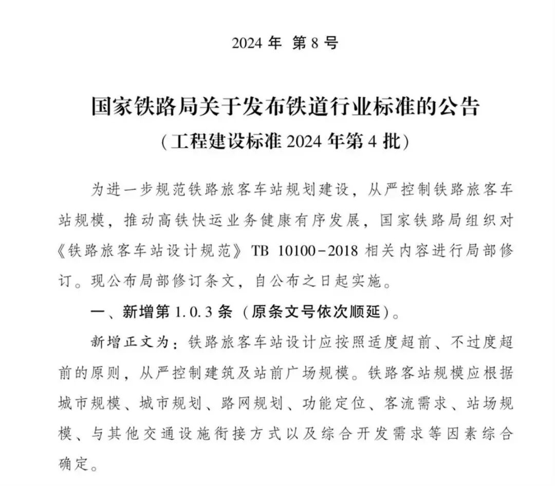 近日,国家铁路局发布行业标准公告,对《铁路旅客车站设计规范》TB 10100-2018(简称《规范》)进行局部修订,进一步规范铁路旅客车站规划建设。