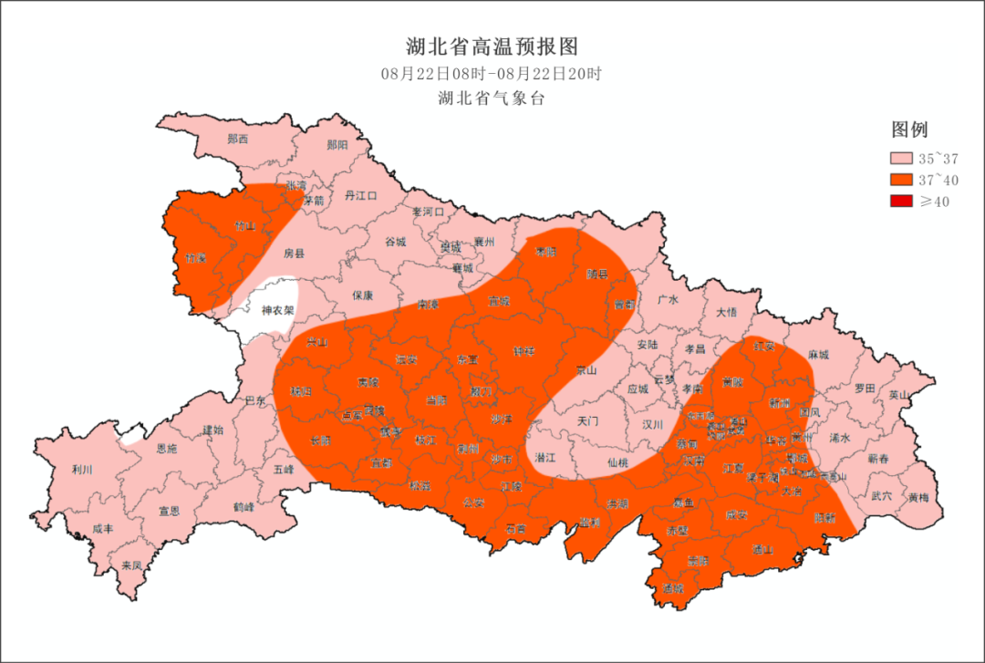 预计8月22日白天,除神农架等高山地区外,全省大部分地区最高气温将超过35℃,其中十堰西部、襄阳东部、宜昌、随州、荆门、荆州、武汉、黄石、鄂州、咸宁等地可达37℃以上,请注意防范。