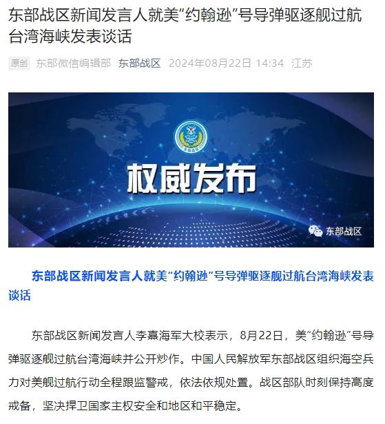 东部战区新闻发言人李熹海军大校表示,8月22日,美“约翰逊”号导弹驱逐舰过航台湾海峡并公开炒作。中国人民解放军东部战区组织海空兵力对美舰过航行动全程跟监警戒,依法依规处置。战区部队时刻保持高度戒备,坚决捍卫国家主权安全和地区和平稳定。