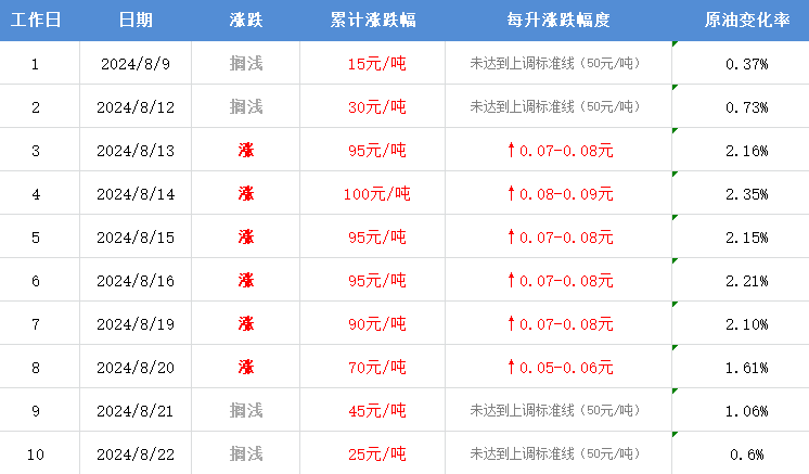 8月22日,本轮国内油价计价统计周期第10个工作日,今日参考原油变化率为0.6%,预测汽柴油上调25元/吨,涨幅未超过上调红线(50元/吨),今晚12点油价调整搁浅,油价保持不变。