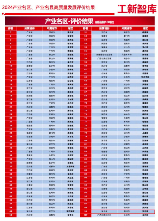 江汉风报道:近日,工业和信息化部新闻宣传中心工新智库、“学习强国”学习平台共同发布了《2024产业名区、产业名县高质量发展评价研究》(下称《研究》),沙市区位列产业名区第99位,为我市唯一入选全国百强产业名区。
