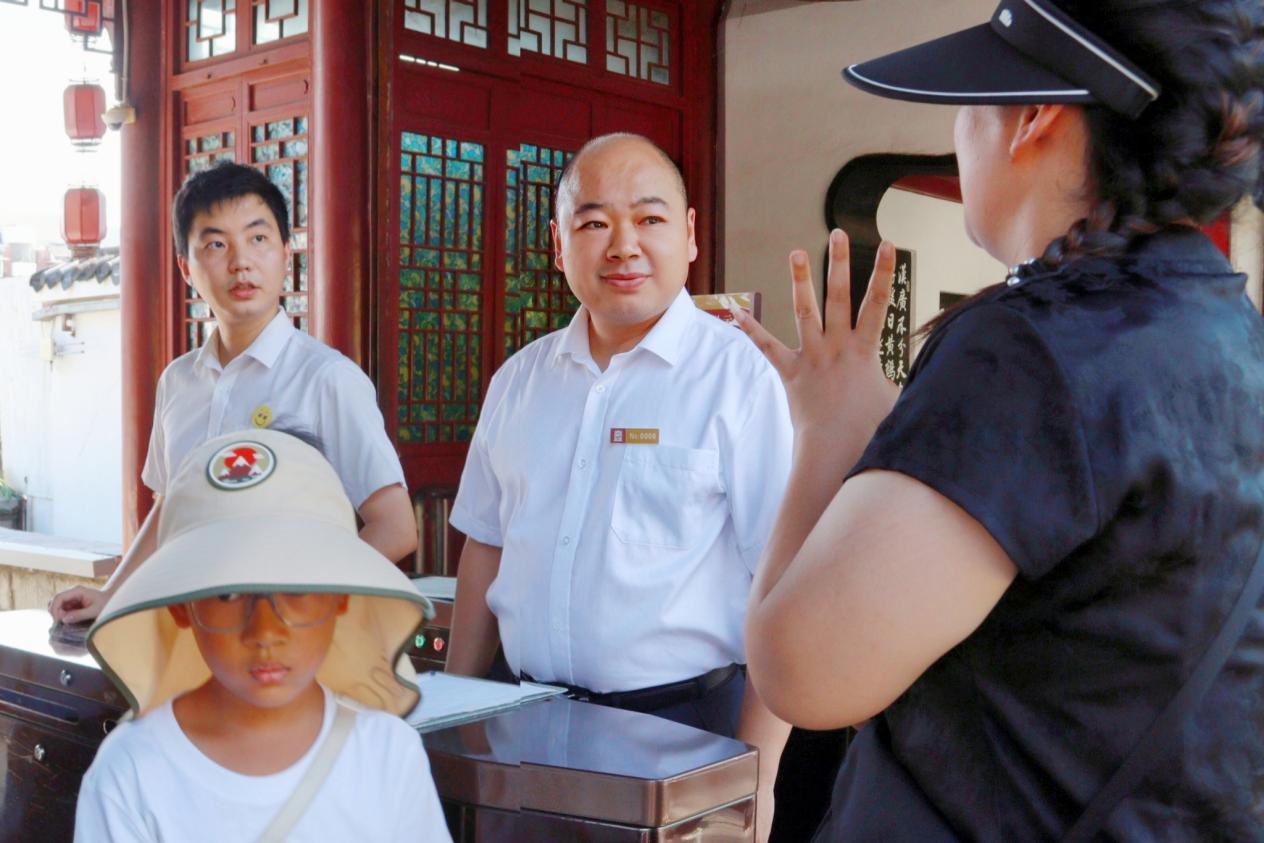 武汉市黄鹤楼公园管理处副主任卢其星(中)正在公园南门笑迎四海游客,为大家游览提供引导服务。田园涵 摄
