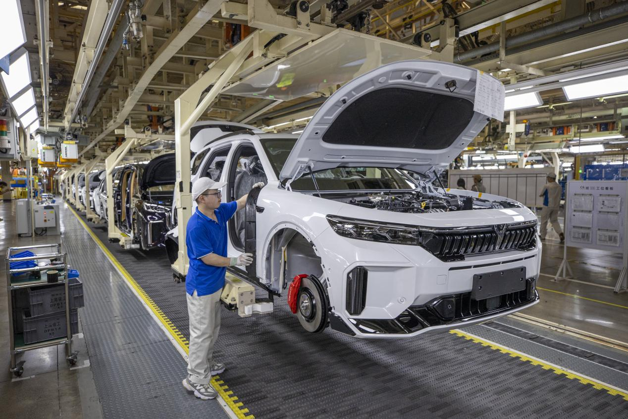 位于武汉经济技术开发区的东风岚图汽车工厂内,工人在装配新能源汽车。张武军 摄