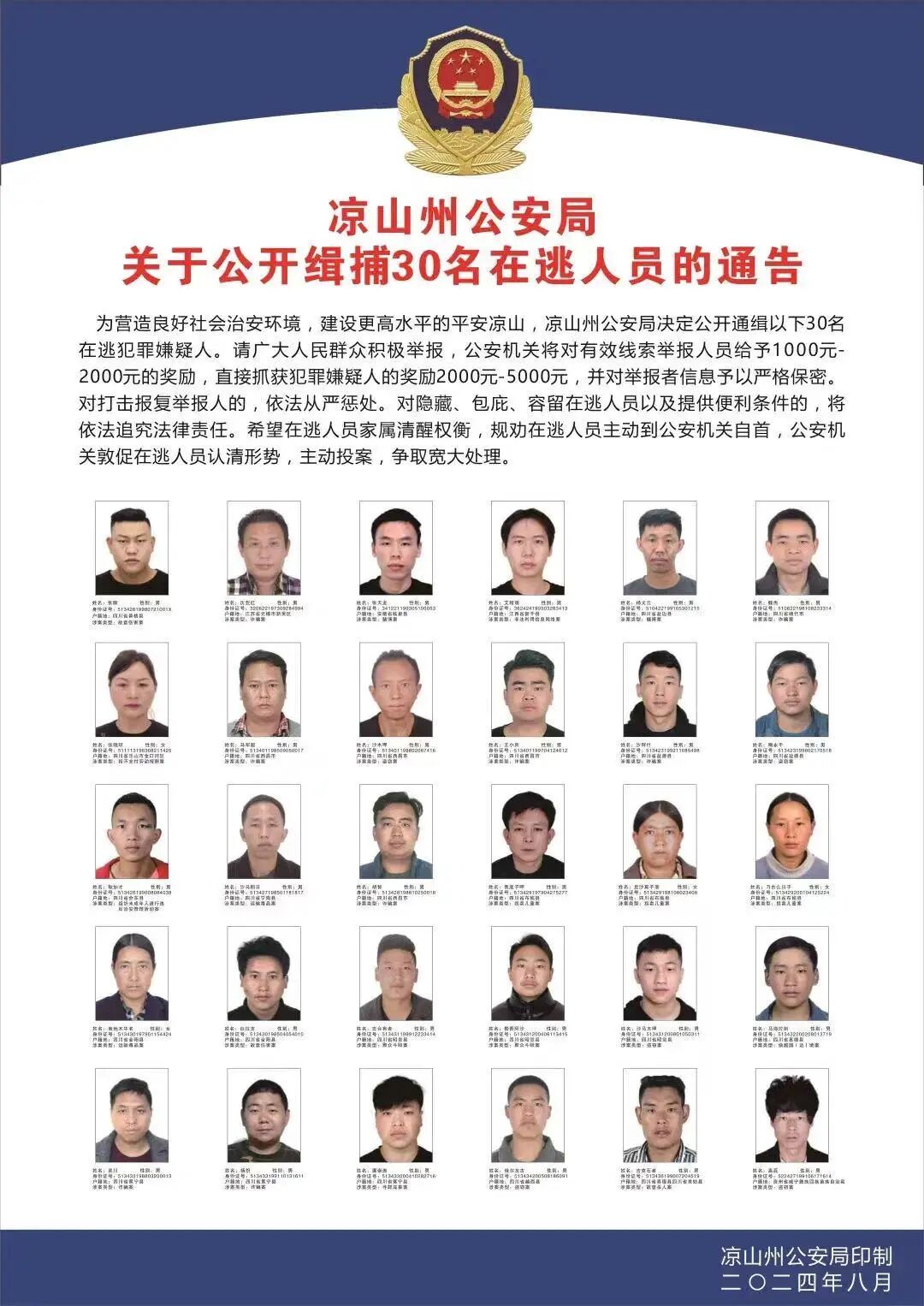 近日,四川凉山州公安局发布《关于公开缉捕30名在逃人员的通告》。通告称,为营造良好社会治安环境,建设更高水平的平安凉山,凉山州公安局决定公开通缉以下30名在逃犯罪嫌疑人。请广大人民群众积极举报,公安机关将对有效线索举报人员给予1000元至2000元的奖励,直接抓获犯罪嫌疑人的奖励2000元至5000元,并对举报者信息予以严格保密。对打击报复举报人的,依法从严惩处。对隐藏、包庇、容留在逃人员以及提供便利条件的,将依法追究法律责任。希望在逃人员家属清醒权衡,规劝在逃人员主动到公安机关自首,公安机关敦促在逃人员认清形势,主动投案,争取宽大处理。