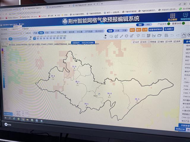未来4~10天(8月30~9月5日),除30日、9月2~3日,荆州市多云有分散性阵雨,其余时间以晴到多云天气为主;气温前高后低,30日~9月2日高温再度加强,3日开始高温又有所缓解;大部高温33~38℃,低温25~29℃。