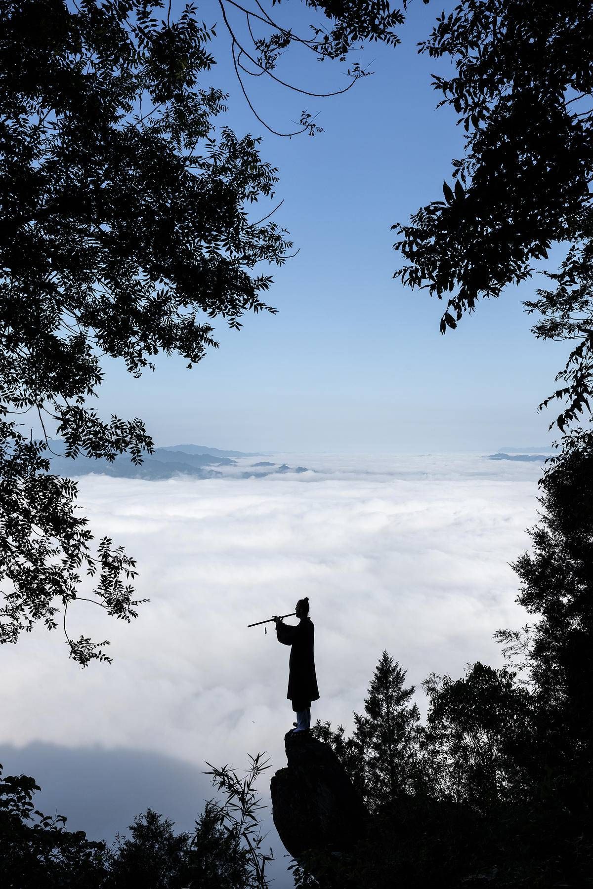 8月19日,在白马山天马峰顶,波兰人达瑞兹面对山谷间的云海练习洞箫。