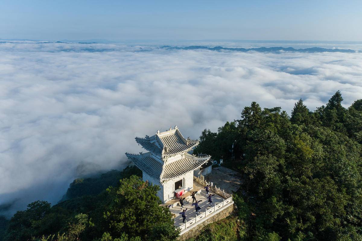 8月19日清晨,在白马山天马峰顶,学员们迎着朝阳练习功夫。